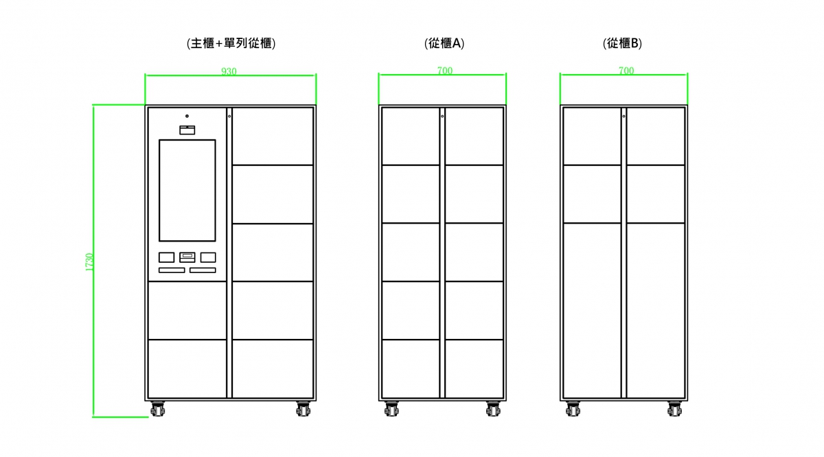 | 標準型: 整體尺寸(主櫃1臺+單列從櫃)(cm)(±3cm) | 寬93x高173x深60 |